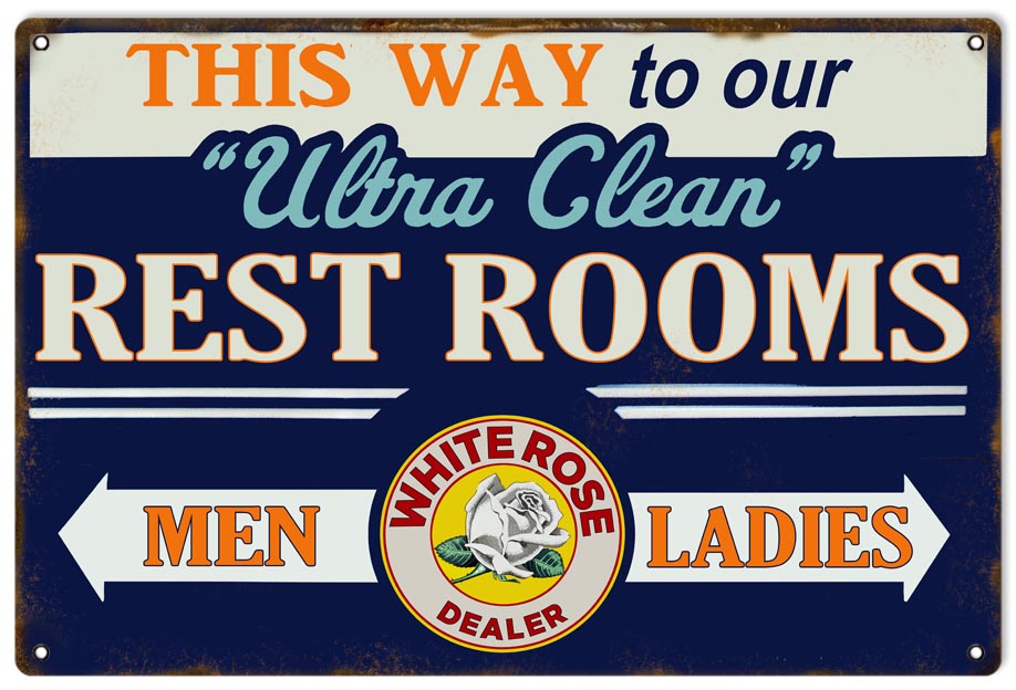 This Way to our Ultra Clean Rest Rooms White Rose Dealer Sign. 12″ x 18″
