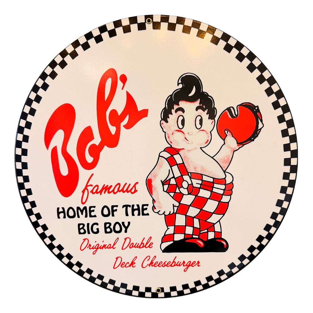 Reproduction Bob’s Big Boy Metal sign. Has 2 eyelets for hanging. Made in the USA