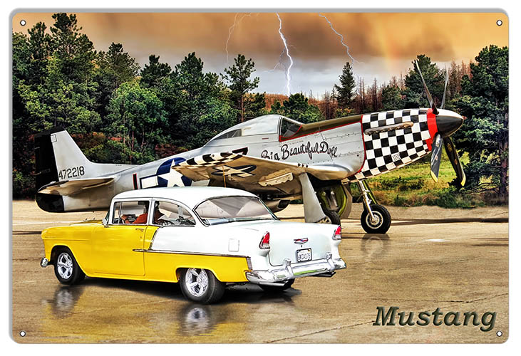 Vintage Mustang Airplane & Classic Chevy Metal Sign By Artist Bob Kramer 12×18 RVG1825