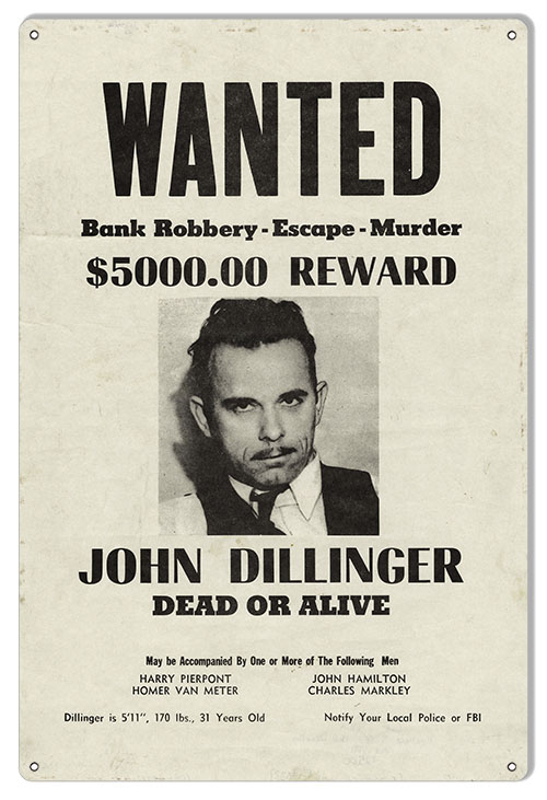 Wanted John Dillinger Dead Or Alive Sign. 12″x18″